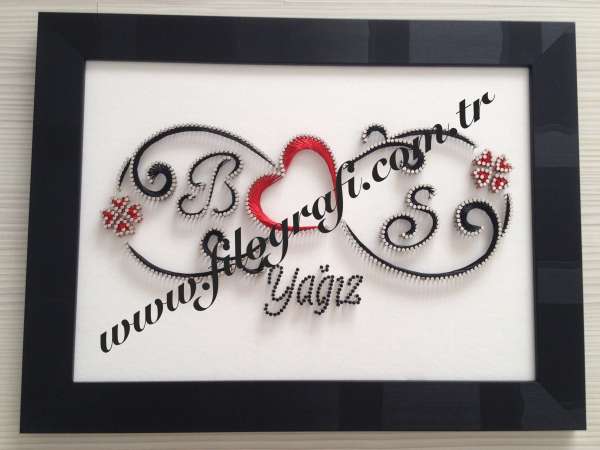 Kişite özel baş harf yazılmış sonsuzluk işareti ve kalp filografi tablo